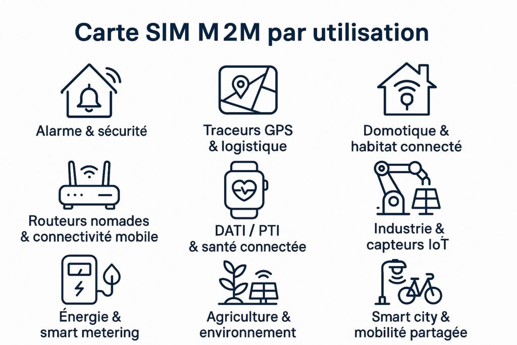 | 🏠 Domotique & objets connectés | 2G / 4G (LTE-M / NB-IoT selon équipement) | 50–500 Mo | Optionnel (alertes) | Continuité de service Surveillance à distance | 2FF / 3FF / 4FF | 1 Go | |