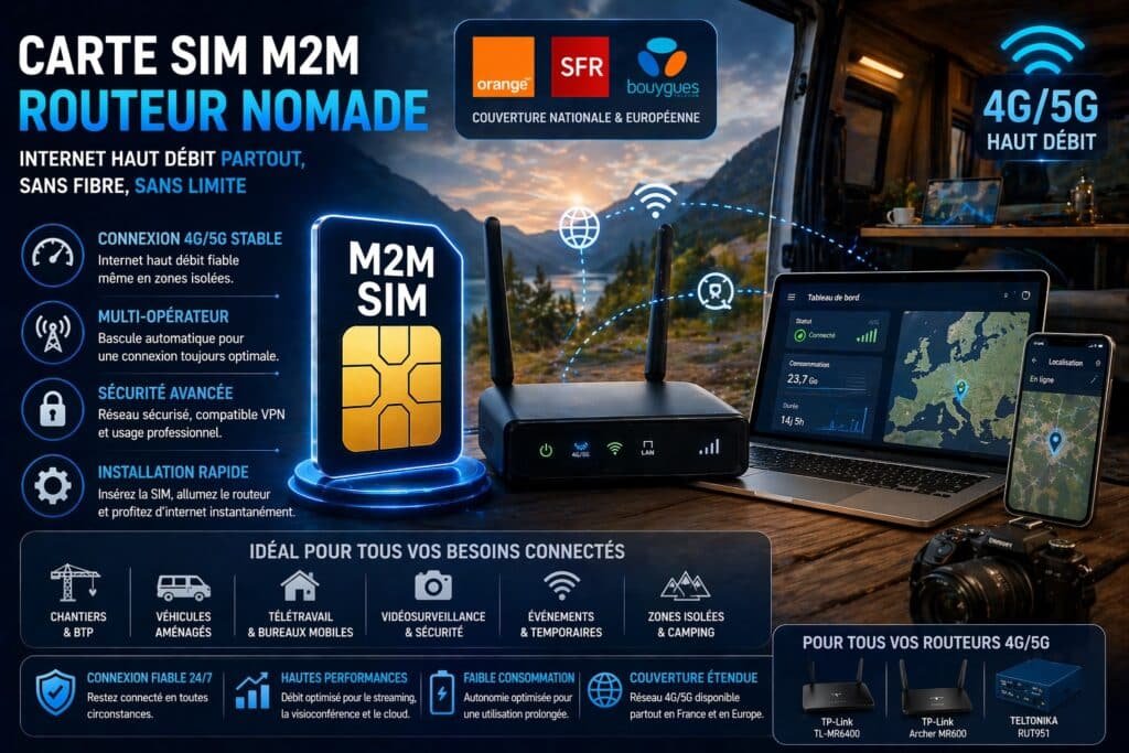 Voir les cartes SIM pour routeur nomade FAQ SIM M2M routeur nomadeContrairement aux cartes SIM classiques, une SIM M2M est conçue pour un usage DATA continu dans des équipements connectés. Elle est idéale pour les routeurs 4G/5G utilisés en environnement professionnel.